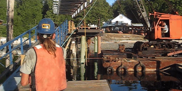 Once the new dock was installed, the old one was barged off Calvert Island as scrap. Its ultimate fate was up in the air until Quadra Island resident Lee Roberts spotted it. The marina at the Heriot Bay Inn (HBI) on Quadra Island, where the Hakai Institute also has an ecological observatory, desperately needed an upgrade to their slippery dock ramp.